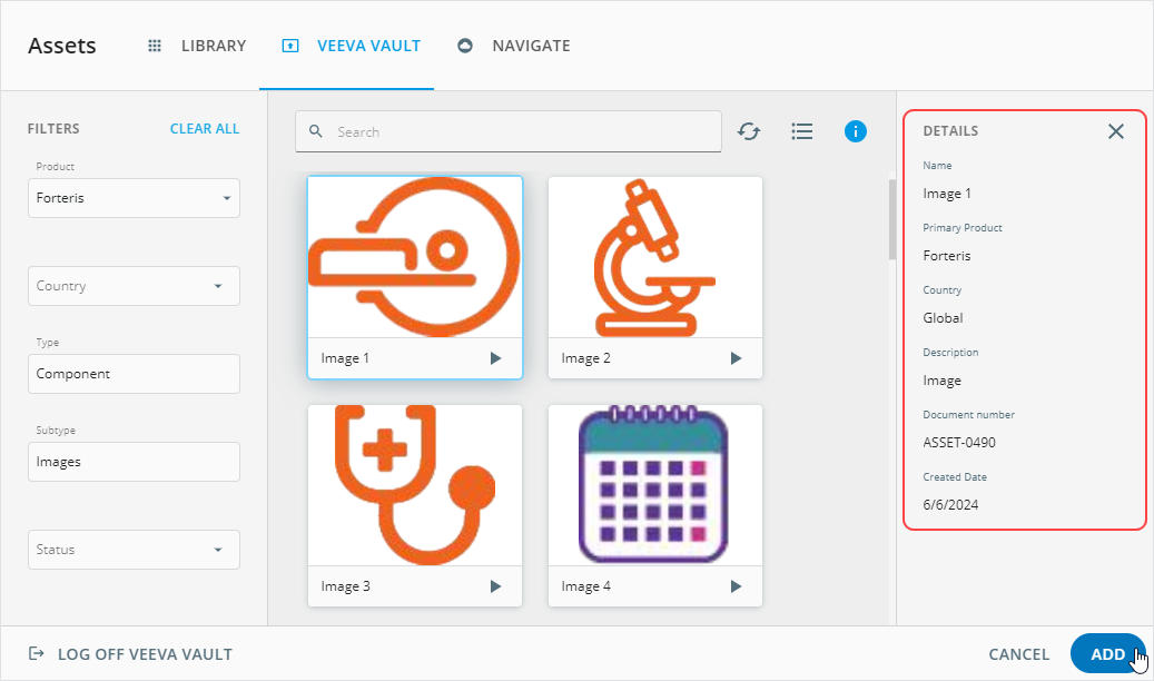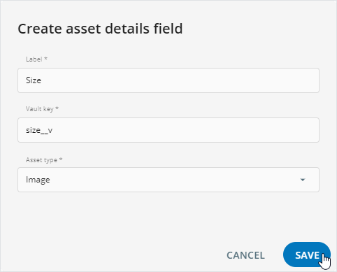Label: Enter the metadata field name to include in theAssetspopup.Vault key: Enter the metadata key from Veeva Vault PromoMats.Asset type: Select the target asset type to display the configured metadata field.