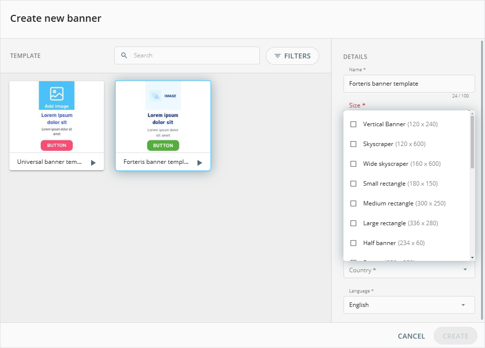 Banneroption from the add new menu. In theCreate newpopup you can select several banner sizes.