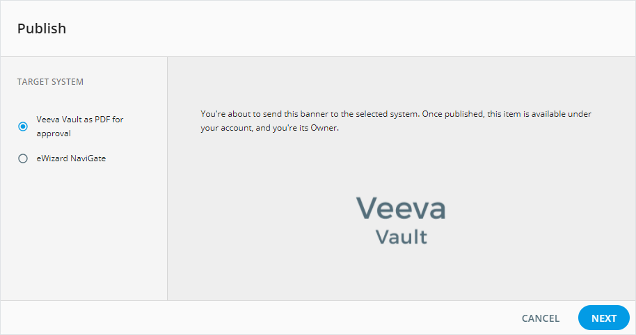 The eWizard Publish service allows you to submit your prepared banner to a target system with minimum manual operations. As a result, your banner is converted to the necessary build, then it's placed to the selected target system under your account according to the metadata specified during the publication process.