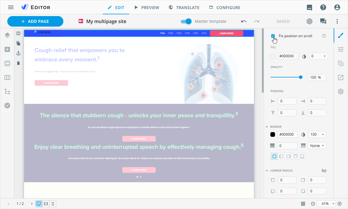 As a result, the block is fixed to the top of the layout and applied to the whole multipage site. To fix the next block, switch off the Master template toggle and apply the Fix position on scroll option to the selected block.